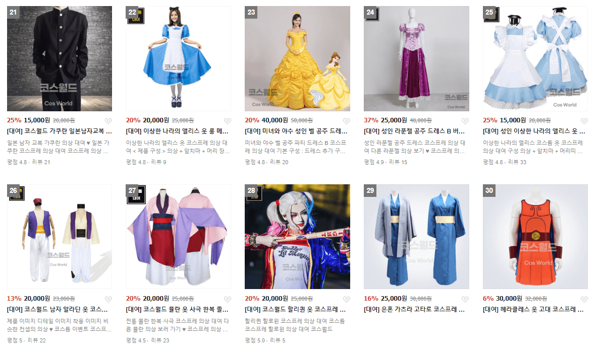 퀄리티가 높고 이 사이트 역시 2박 3일 대여입니다. 리뷰도 모두 좋아 캐릭터 코스튬을 생각하시는 분들께 강력추천드립니다.